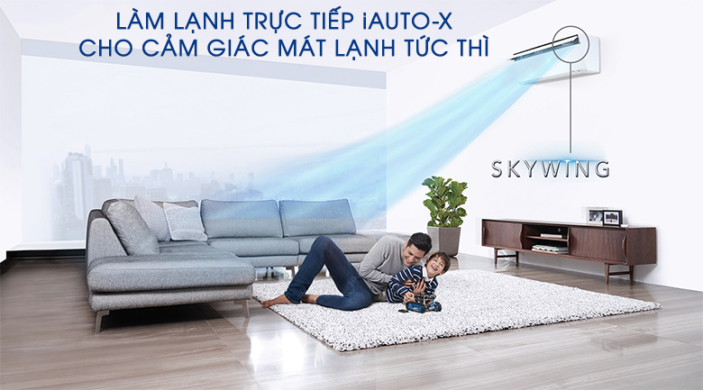 Có thiết kế cánh đảo gió theo dạng Skywing, miệng cánh hướng lên phía trên giúp hướng luồng gió thổi lên trần nhà. Luồng không khí lạnh sẽ chạy dọc trên bề mặt trần và tường, rồi tỏa vào không gian, tránh thổi trực tiếp vào người. Tạo cảm giác mát lạnh cực dịu êm, đặc biệt tốt cho làn da nhạy cảm của trẻ nhỏ.